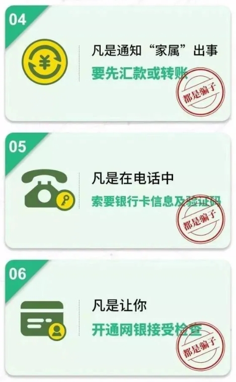 (3)凡是自稱(chēng)公檢法機(jī)關(guān)或醫(yī)保局等部門(mén),以涉嫌嚴(yán)重違法犯罪并需要保密等為由,索要銀行卡信息及密碼、驗(yàn)證碼進(jìn)行“資金清算”或者讓你直接把錢(qián)打到所謂的“安全賬戶(hù)”的。